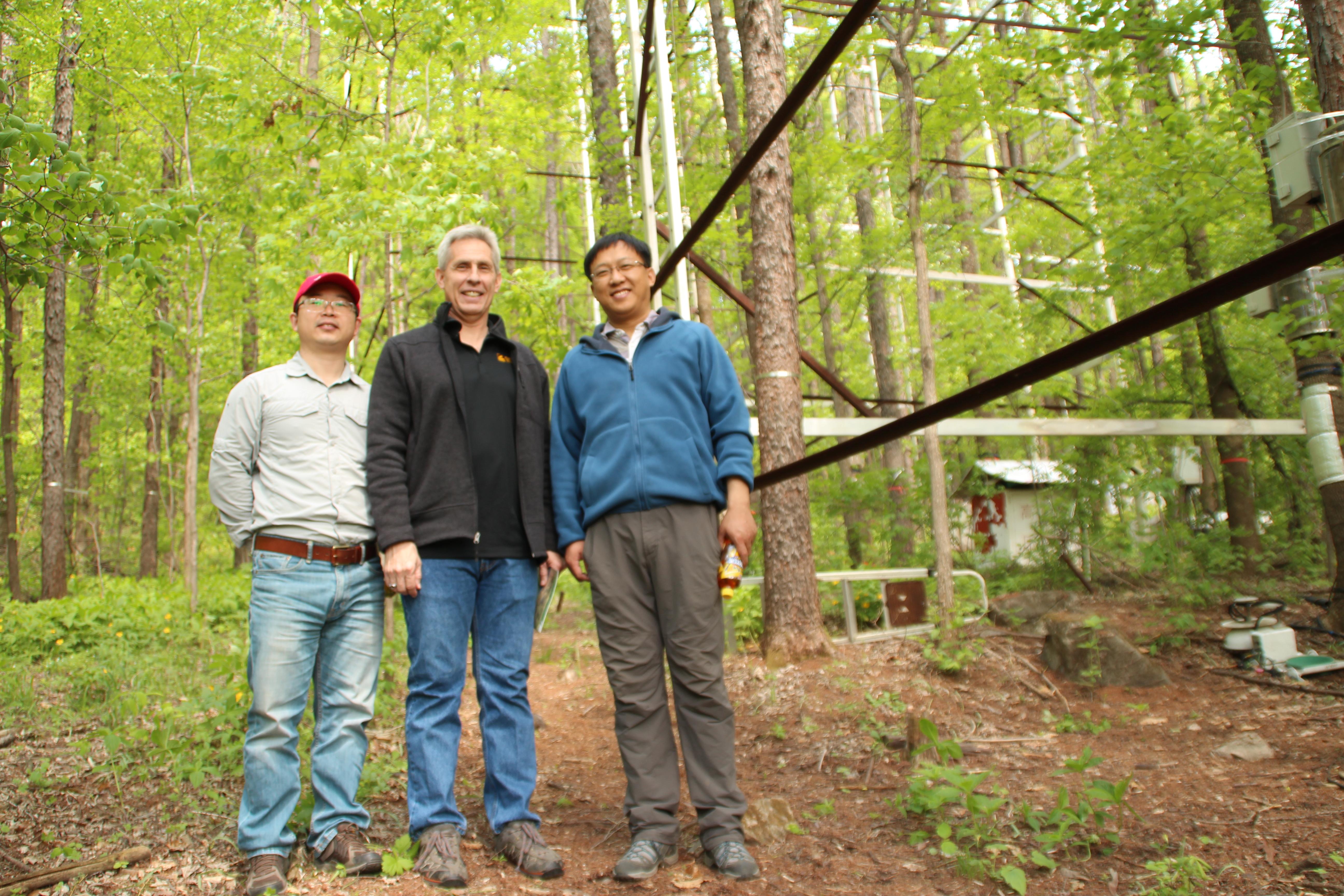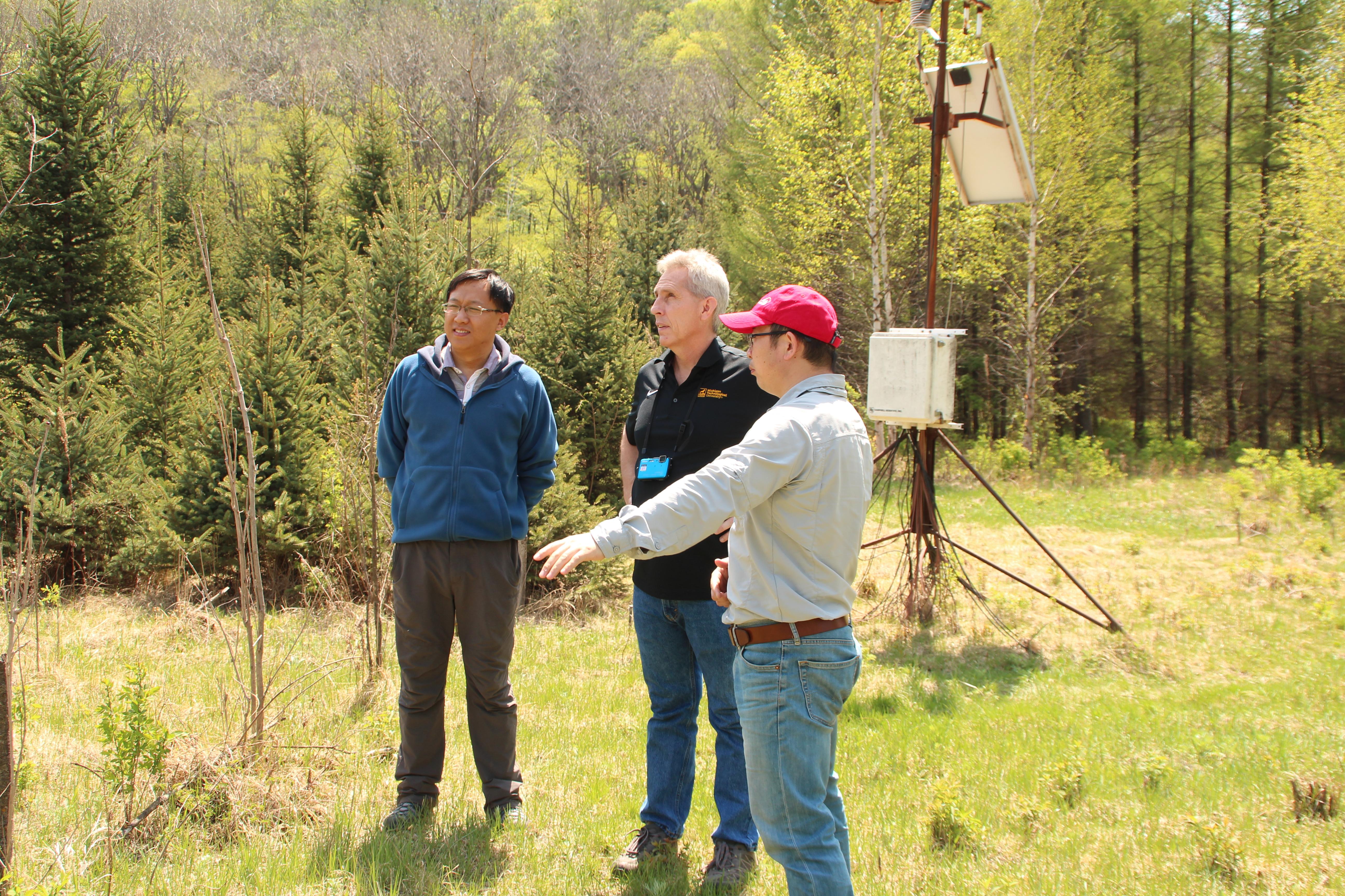 5月15日上午10时,Andrew Burton教授在谷加存副教授的陪同下,前往帽儿山森林生态系统国家野外科学观测研究站进行科学考察和参观。张全智老师首先对实验站45年的研究工作向Andrew Burton教授做了简单介绍。随后张全智老师和谷加存副教授重点向Andrew Burton教授详细介绍了在水曲柳和落叶松混交林固定样地开展的土壤呼吸和树干呼吸方面的研究工作。双方在生态系统碳、氮、水循环、碳水耦合方面以及全球变化等方面研究进行了深入的探讨和交流。最后张全智老师和谷加存副教授又在同质园内对客人介绍了模拟气候暖化对兴安落叶松生态系统的影响,并进行了深入的交流。