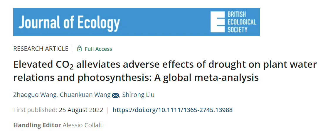 近日,我校林学院生态研究中心王传宽教授团队在全球变化与植物生理生态领域的研究取得新进展,成果以题为《CO2浓度升高缓解干旱对植物水分关系和碳同化的不利影响》(Elevated CO2 alleviates adverse effects of drought on plant water relations and photosynthesis: a global meta-analysis)的论文发表在著名生态学期刊《Journal of Ecology》上。