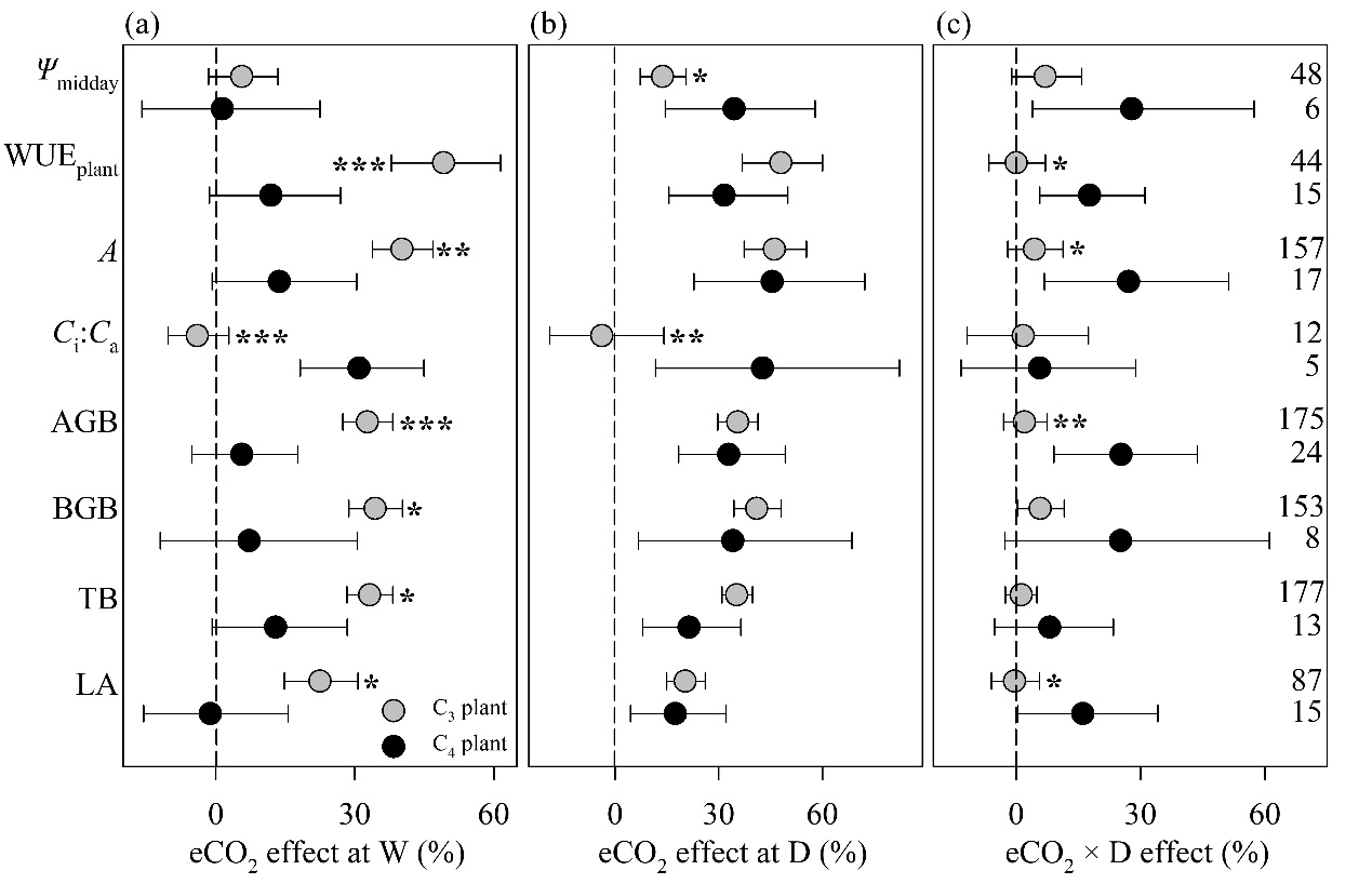 全球气候变化引起的干旱事件,严重影响植物的生存、生长和固碳能力,对植被生态系统服务功能产生深远影响。然而,大气CO2浓度升高可以提高植物的光合速率、减少其蒸腾失水,进而提升其水分利用效率。目前CO2浓度升高和干旱事件通常是同步发生的,但是两者的联合作用对植物生理生态和固碳效应的影响及其生理机制尚不明确。为此,该团队整合了全球范围内的226个研究,涵盖了166个植物种的16个生理生态指标,综合分析了干旱和CO2浓度升高及其交互作用对植物水分关系、光合作用、水分利用效率、生物量生产与分配的影响。