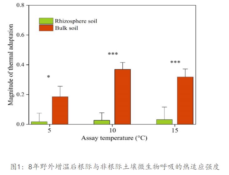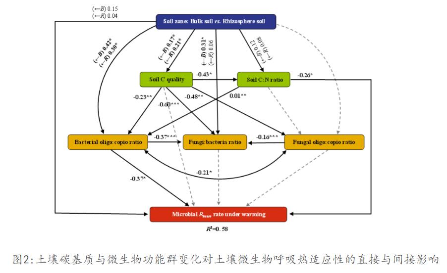 过去20年中,微生物呼吸的热适应性被认为是影响土壤碳-气候反馈方向与强度的关键机制之一。然而,微生物群落如何调控这种热适应性,是当前悬而未决的重要科学问题,制约了人们对未来气候变化下陆地土壤碳收支的准确预测。为解决这一难题,陈鸿洋等研究人员巧妙地以根际和非根际土壤的微生物群落为研究对象,以微生物r/K生态策略为切入点,探究长期增温处理下微生物生态策略如何影响土壤微生物呼吸的热适应性。研究发现,相比r策略微生物占优势的根际土壤,K策略微生物占优势的非根际土壤呼吸对长期增温具有更强的热适应性(图1),且土壤碳的有效性显著影响微生物的生态策略,间接改变土壤微生物呼吸的热适应(图2)。这一发现将增进人们对土壤微生物热适应性调控机理的理解,为准确预测陆地土壤碳-气候反馈提供重要的科学依据。