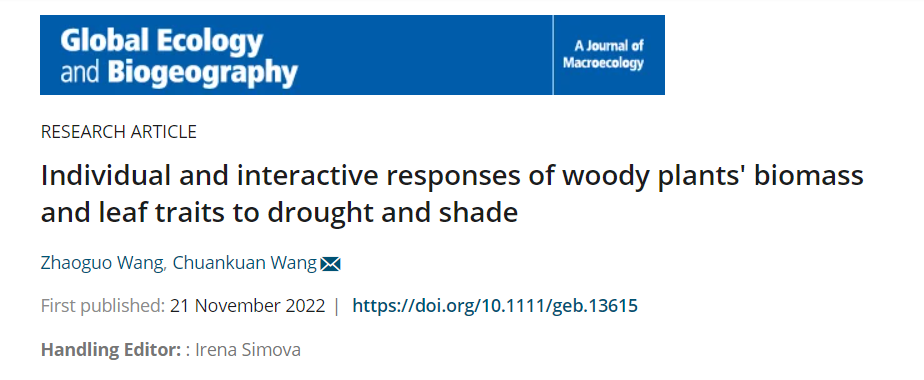 近日,我校生态研究中心王传宽教授团队的博士后王兆国,在著名生态学期刊《Global Ecology and Biogeography》发表了题为《木本植物生物量和叶性状对干旱和庇荫的独立作用和交互作用的响应》的论文,揭示了树木幼苗对干旱和庇荫胁迫的驯化和适应机制。