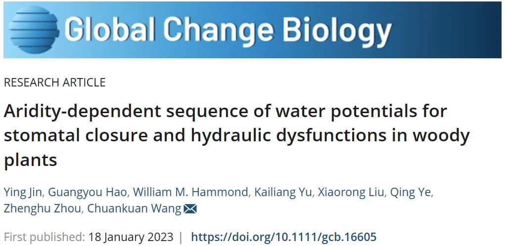 近日,我校生态研究中心王传宽教授团队的青年教师金鹰在国际著名生态学期刊《Global Change Biology》(IF=13.2)发表了题为“Aridity‐dependent sequence of water potentials for stomatal closure and hydraulic dysfu-nctions in woody plants”的研究论文。文章指出了该团队在树木水分关系与全球变化领域的研究新进展。